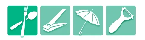 와인따개, 병따개, 감자칼, 수조, 포크, 손톱깎이, 긴 우산, 족집게, 손톱정리가위, 바늘류, 제도용 컴퍼스 등