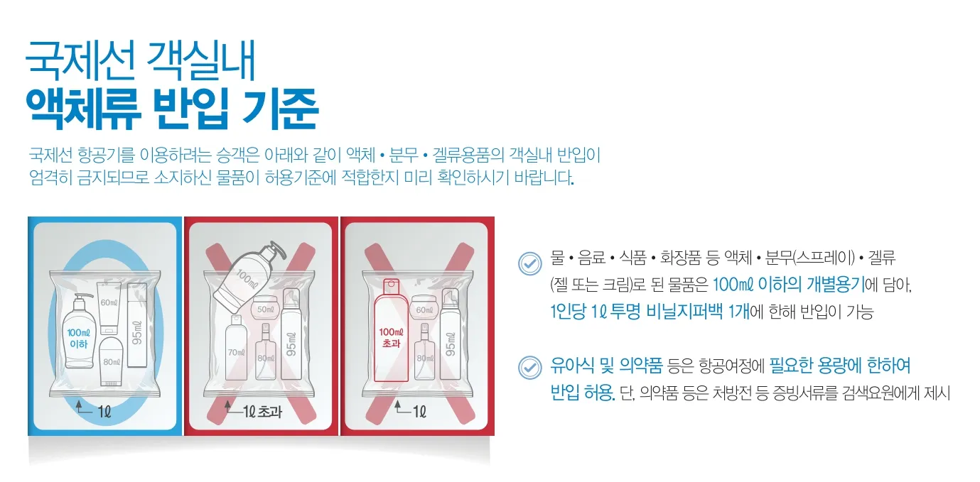 <단, 국제선 객실 반입 시 100ml 이하만 가능, 위탁 수하물인 경우에는 개별 용기 500ml 이하로 1인당 2kg(2L)까지 반입 가능하답니다.>