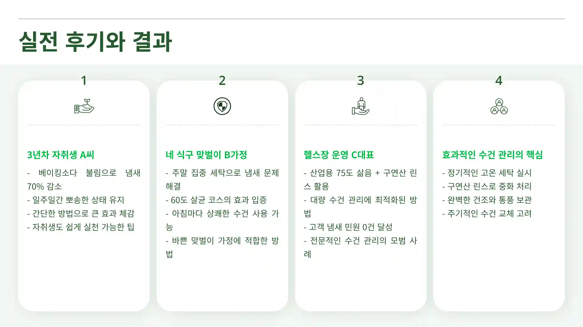 “베이킹소다 불림만으로도 수건 냄새가 70% 줄었어요. 한 번 잡으니 일주일은 뽀송.”